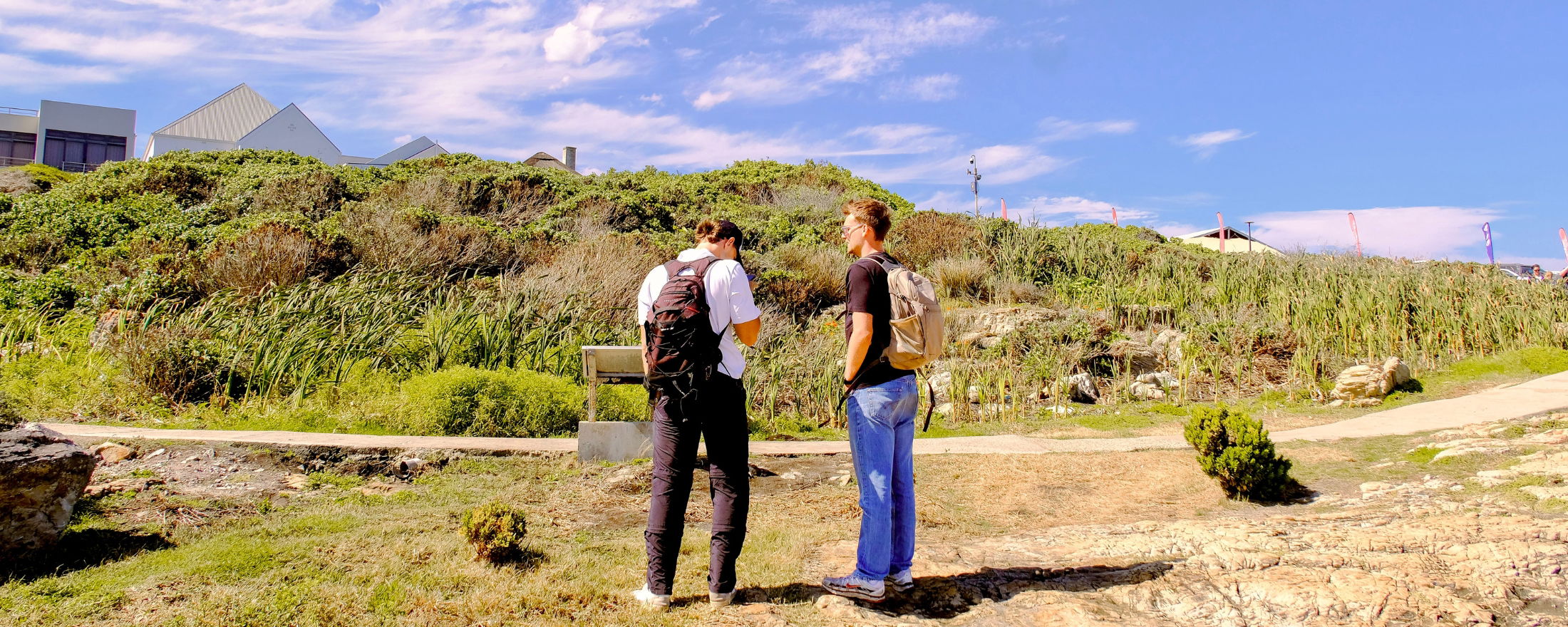 Along the way, Jonas told us not to miss the Hermanus Biodiversity Walk, so of course, we had to check it out. We wandered along the cliffs, surrounded by wildflowers, sculptures facing the sea, and felt the air of salt and the sound of the waves all around us. During the walk, we met the cutest little animals called dassies, also known as hyraxes. They kind of look like chubby rabbits, but believe it or not, they’re actually distant relatives of elephants.